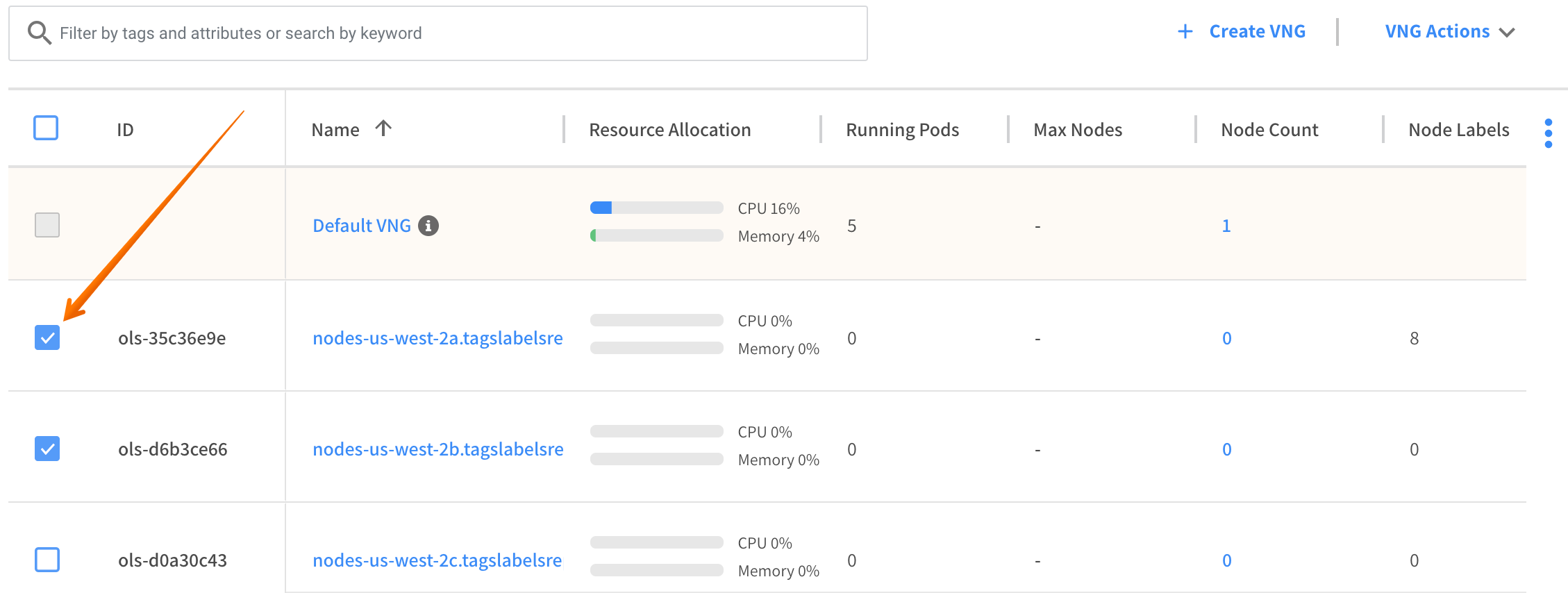 1. In your Ocean cluster, click the Virtual Node Groups tab.